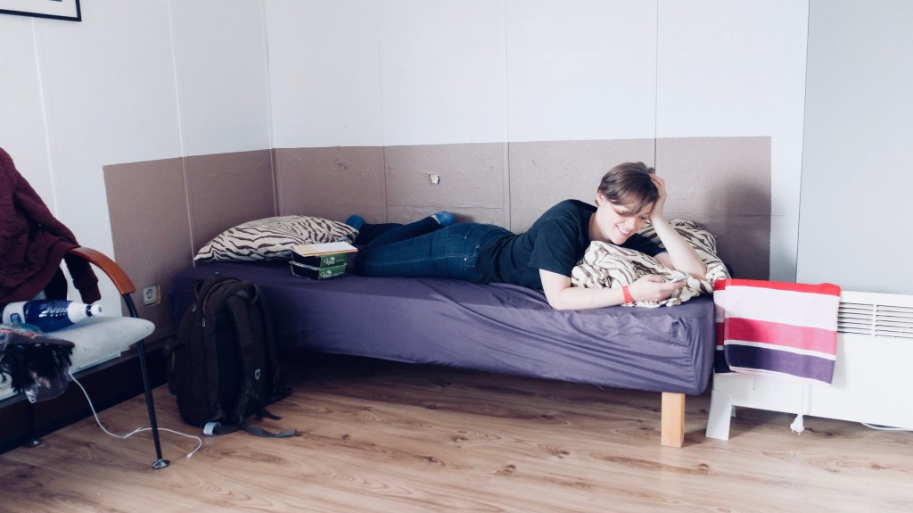 olin mõni aeg enne minekut narva viimase vaba toa meile broneerinud. kõik teised olid juba kinni, sh hotellid. ma ei teadnud milline see välja näeb või kuidas me seal elama hakkame. tuli välja, et see tuba oli ainuüksi selle nädala üks elamusi. tuba oli piisavalt suur – mahtusime sinna kenasti ära. küll aga oli teekond meie tuppa… eee… huvitav. alguses ronisime üles kenadest betoontreppidest. seejärel viitasid sildid, et peame veel ühe korruse võrra kõrgemale minema… ja see metallist keerdtrepp oli juba natukene ohtlikuma välimusega.