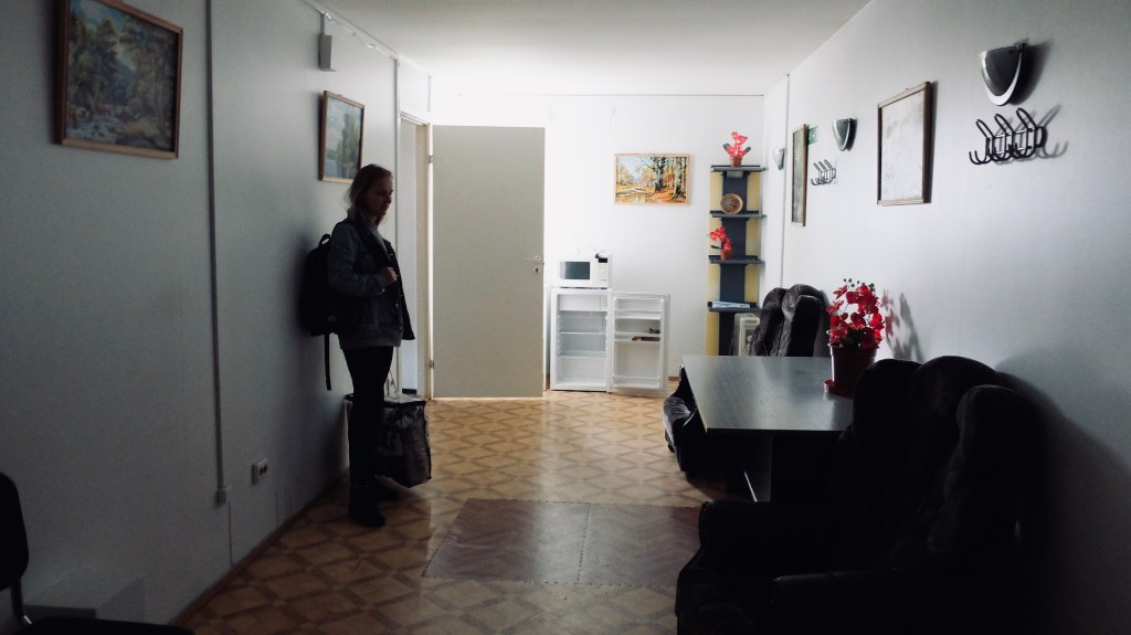 olin mõni aeg enne minekut narva viimase vaba toa meile broneerinud. kõik teised olid juba kinni, sh hotellid. ma ei teadnud milline see välja näeb või kuidas me seal elama hakkame. tuli välja, et see tuba oli ainuüksi selle nädala üks elamusi. tuba oli piisavalt suur – mahtusime sinna kenasti ära. küll aga oli teekond meie tuppa… eee… huvitav. alguses ronisime üles kenadest betoontreppidest. seejärel viitasid sildid, et peame veel ühe korruse võrra kõrgemale minema… ja see metallist keerdtrepp oli juba natukene ohtlikuma välimusega.