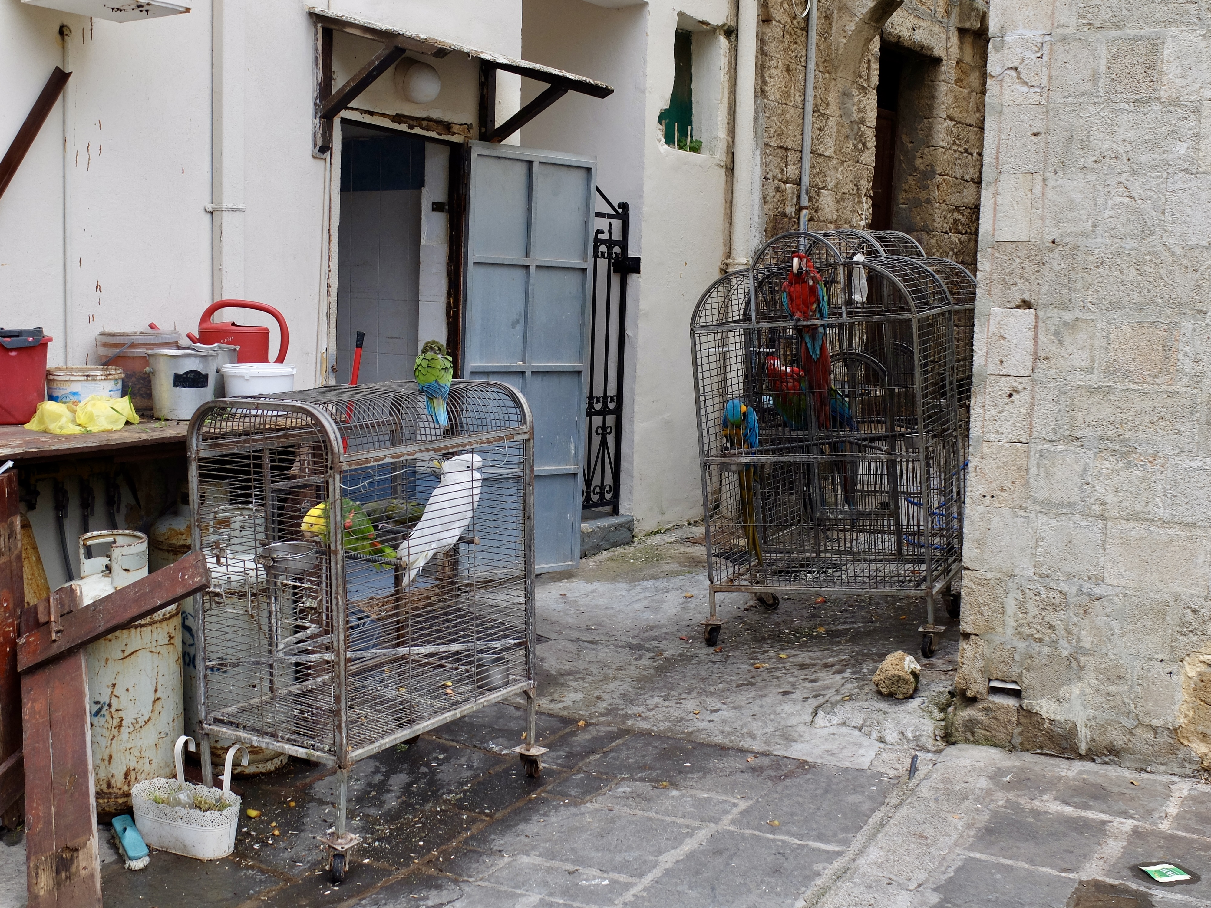 see viimane pilt tegi mareki väga kurvaks. need linnud on rhodosel turistide mängukannid. nende elamistingimused – puurid – ei ole nende jaoks piisavalt suured. käisime neist mitmeid kordi mööda ja marek isegi kaalus, et astub ligi ja küsib, miks ometi nii. aga ei olnud kedagi, kelle käest küsida.